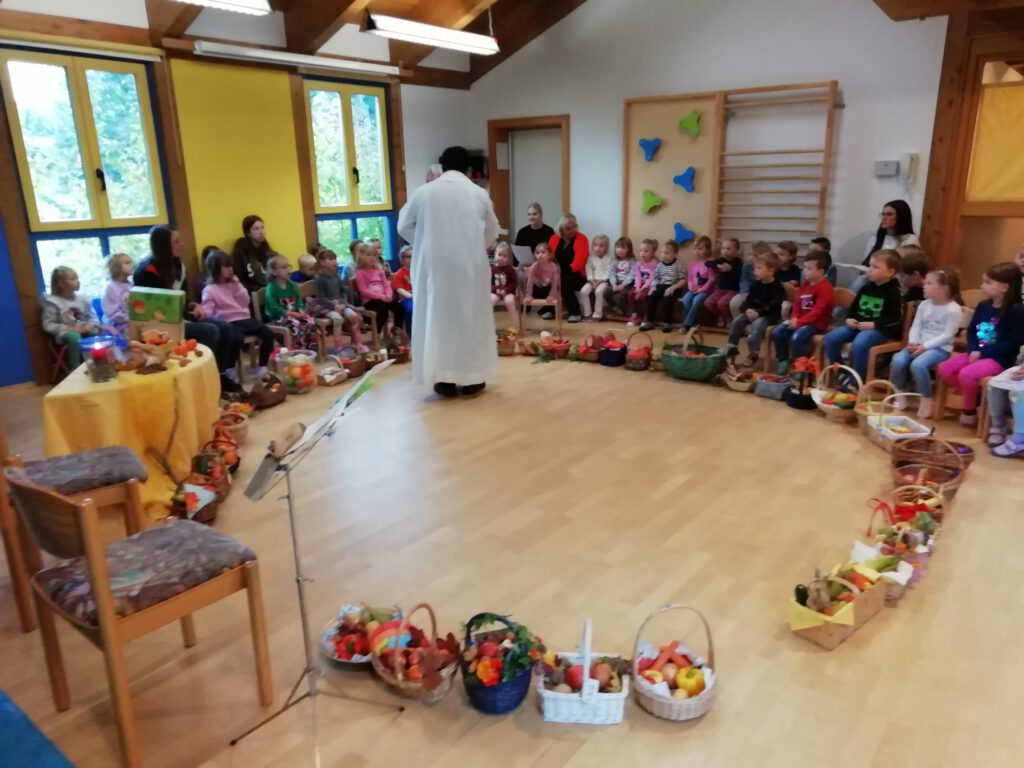 Die Kindergarten- und Krippenkinder haben Körbchen mit Erntegaben mitgebracht und danken Gott in einer Andacht für die Gaben.